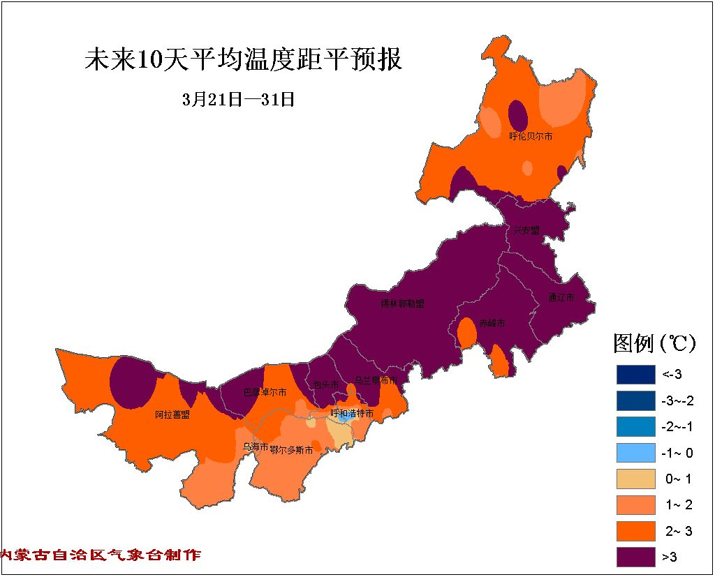 另外,今天进入春分节气,意味着太阳直射点跨过赤道,向北半球挺进,相应的北半球热量越来越足,气温升高。据内蒙古气象台3月下旬天气预报预测,未来10天,西部偏东南、中部偏西南部分地区气温较常年同期偏低-1~1℃,西部偏北、中部偏北和偏东、东部偏南大部地区气温较常年同期偏高3℃以上,其余地区气温较常年同期偏高1~3℃。