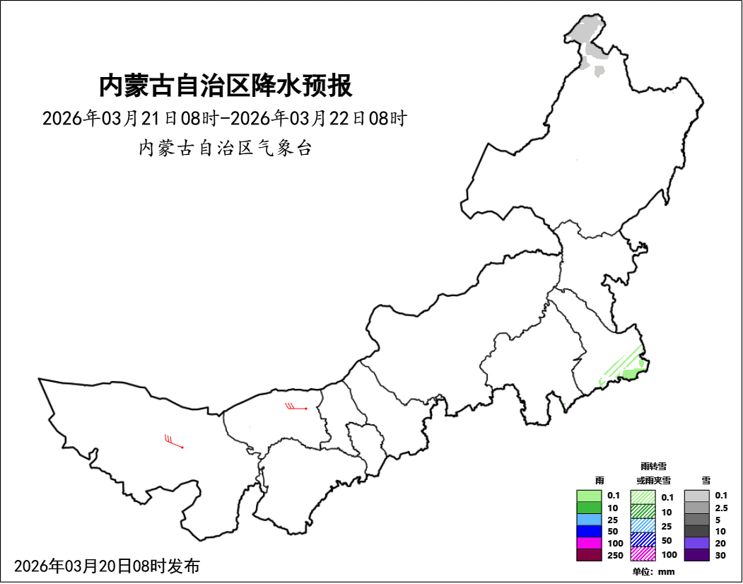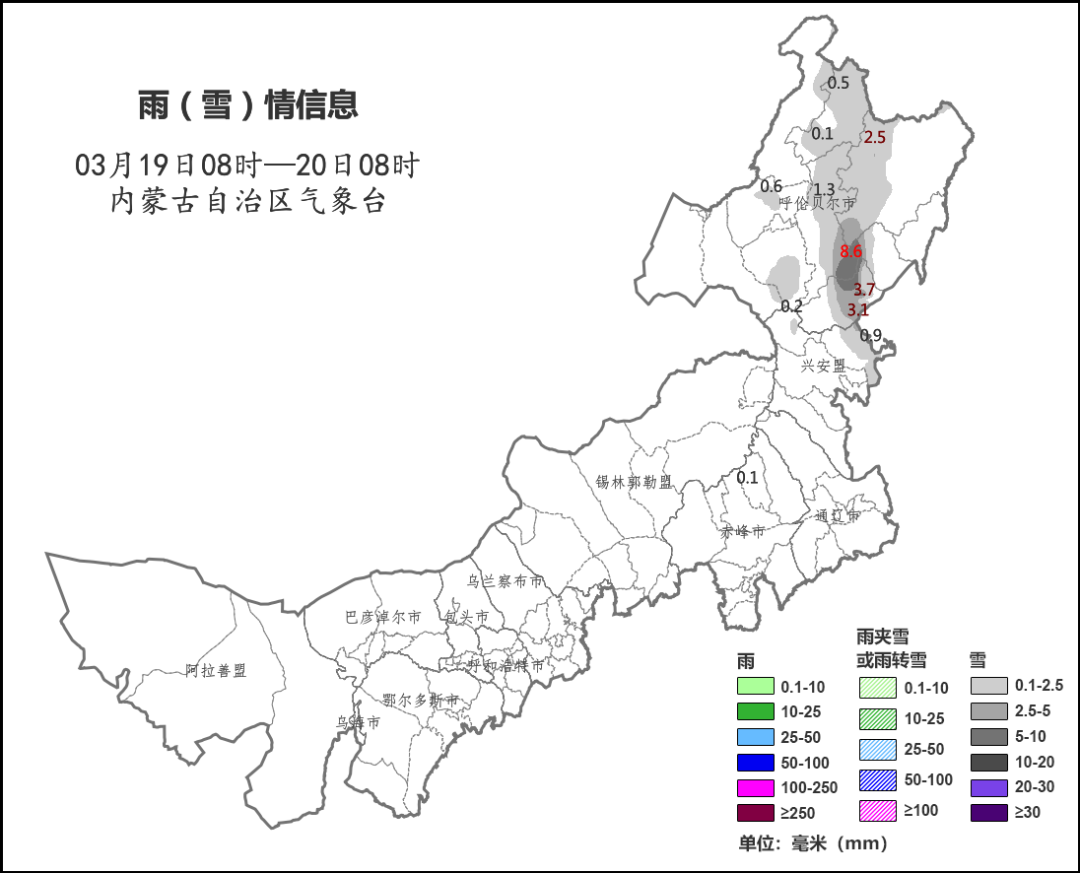 昨天,冷空气结束后,全区降水范围和强度也逐渐缩小减弱。监测显示,19日08时-20日08时,全区3个盟市9个旗县的40个站点出现降水,范围0.1~8.6毫米。降水出现在呼伦贝尔市、兴安盟、赤峰市。其中,2个旗县3个站点出现大雪,为呼伦贝尔市牙克石市博克图镇喇嘛山8.6毫米,扎兰屯市鄂伦春民族乡6.3毫米、成吉思汗镇建设应用(旅游)6.2毫米;4个旗县6个站点出现中雪;8个旗县30个站点出现小雪;另有1个旗县1个站点出现小雨夹雪或雨转雪,为赤峰市巴林左旗哈拉哈达0.1毫米。