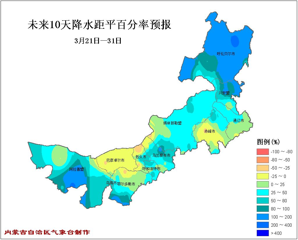 降水方面,3月下旬,西部偏东北、中部偏西北、东南部偏西部分地区降水较常年偏少0~50%,西部偏西和偏南、中部偏西部分地区、东北部大部降水较常年偏多50%以上,其中阿拉善盟西南部、鄂尔多斯市南部、乌兰察布市北部部分地区、兴安盟北部、呼伦贝尔市大部降水较常年偏多80~200%,局地偏多200~400%,其余地区降水较常年偏多0~50%。降水偏少的地区,要提前做好准备,抗御春旱。